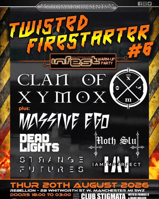 Twisted Firestarter has become the eagerly anticipated warm up party for the Infest Festival and always delivers a fantastic party atmosphere to get the festival off to a cracking start. This year we are proud to bring as an incredible headliner the pioneering stalwarts of the electro-goth scene CLAN OF XYMOX! This will be an exclusive UK show for them.