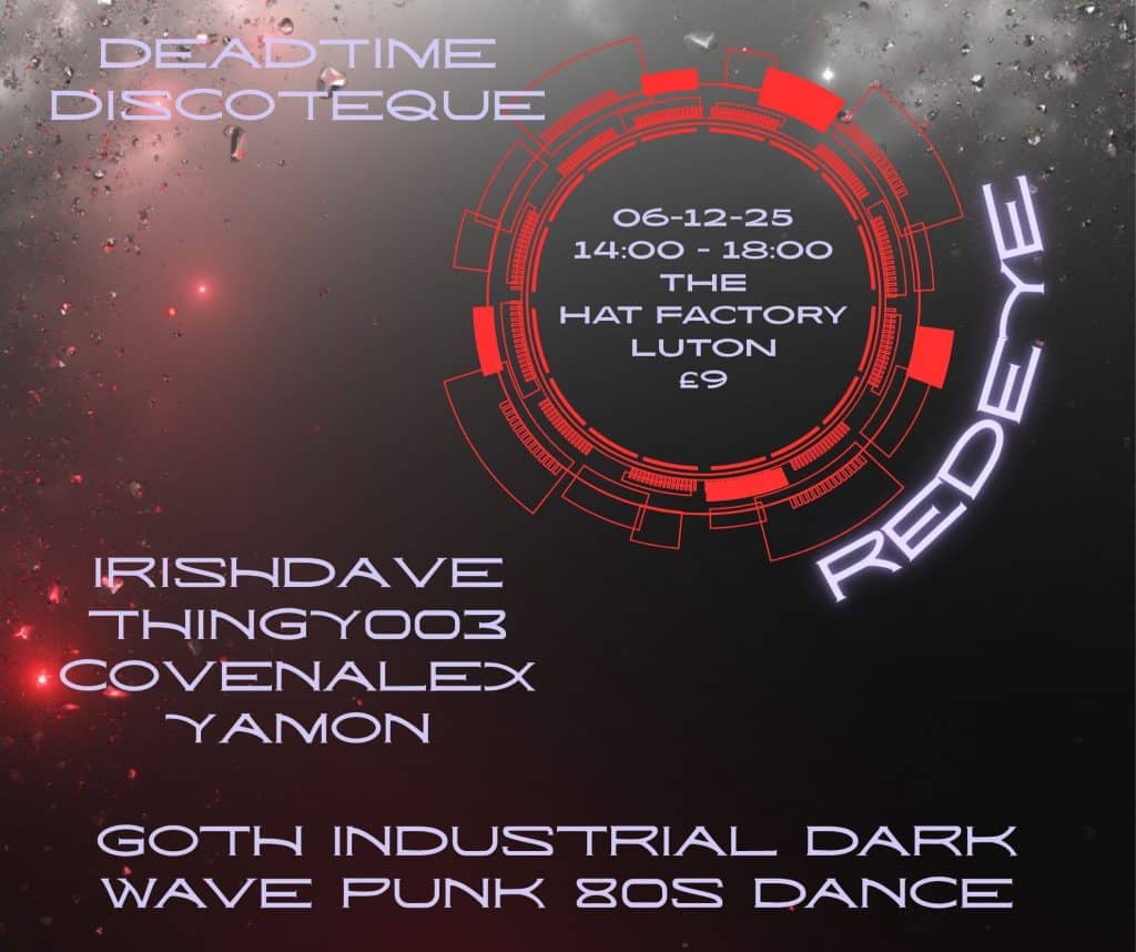 Luton’s premier goth / industrial night from the mid nineties is back with a new daytime discotheque for all the dark deviants and cyber freaks. Now there is a whisper in the shadows, a stirring in the crypts, a breath felt on the back of your neck in an empty room. Something is definitely happening. RedEye returns with a daytime discotheque for all the dark deviants and cyber kids to dust of the cobwebs and dance through the afternoon down in the Hat Factory crypt. Away from the daylight. Old and new DJs will be playing a mix of goth,