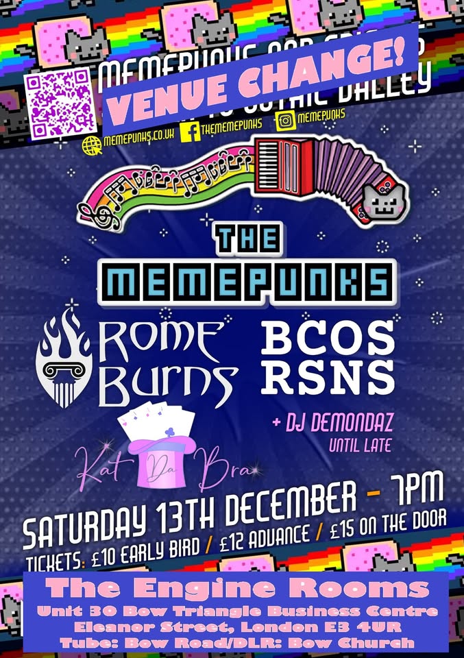 IMPORTANT! VENUE CHANGE!!!Due to a clash with an Arsenal football match (!), we have had to find a new venue. This will now take place at The Engine Rooms in Bow. Original tickets are valid and early bird tickets are still available!The Memepunks return with a full-length set featuring our brand new mash-ups along with your favourite classics!With support from our friends:*ROME BURNS*BCOS RSNS*Compered by MS KAT DaBRA*With DJ Demondaz until late.Early bird tickets £10, now on sale while supplies last!
